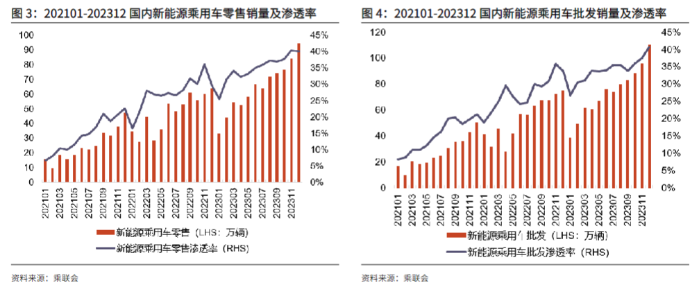 乘联会发布数据显示,2023年12月乘用车市场零售达235.3万辆,同比增长8.5%,2023年累计零售2169.9万辆,增长5.6%。新能源车方面,2023年12月国内新能源车市场零售94.5万辆,同比增长47.3%;2023年累计零售773.6万辆,增长36.2%。