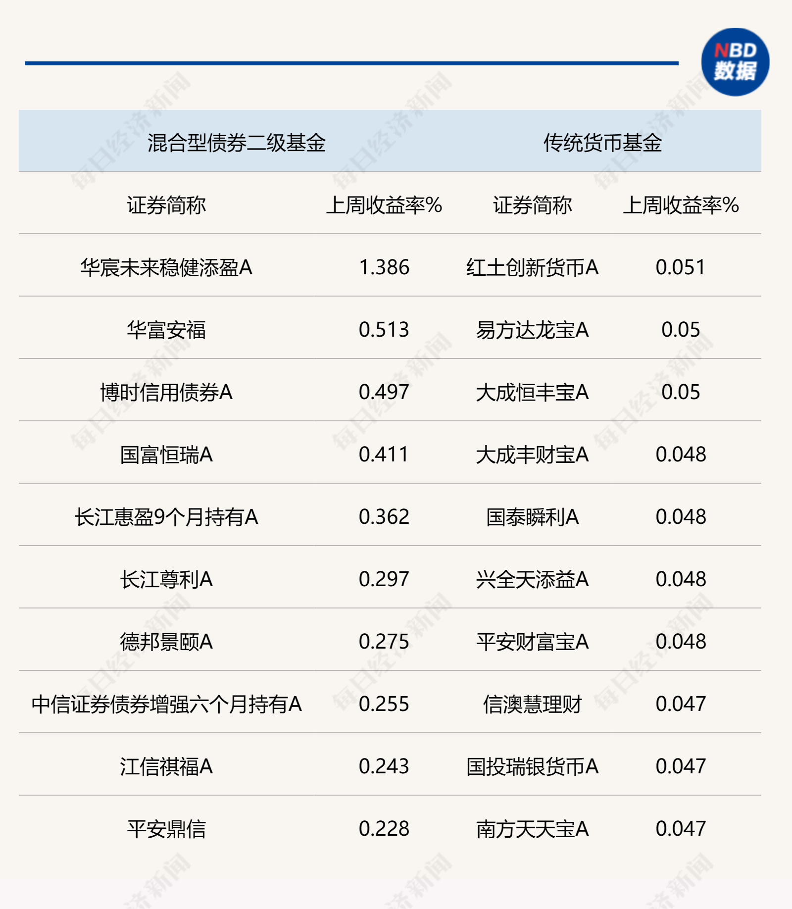 上周,债券型基金当中,表现较好的当属混合型产品,如华宸未来稳健添盈A收益达到1.3858%,而纯债型基金的收益则普遍不高,最高也仅有0.4%左右的周内收益率。