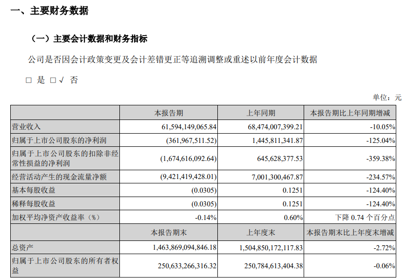 万科企业在港交所公告,2024年第一季度营业收入615.94亿元,同比下降10.05%,专业在线配资净亏损3.62亿元,去年同期净利润14.46亿元。