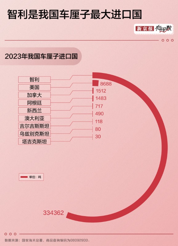 2023年11月底,智利车厘子委员会经理克劳迪娅·索莱尔(Claudia Soler)称,2023-2024车厘子季,智利出口的车厘子88%运往中国,其次是美国(7%)和巴西(1%),63%是空运。