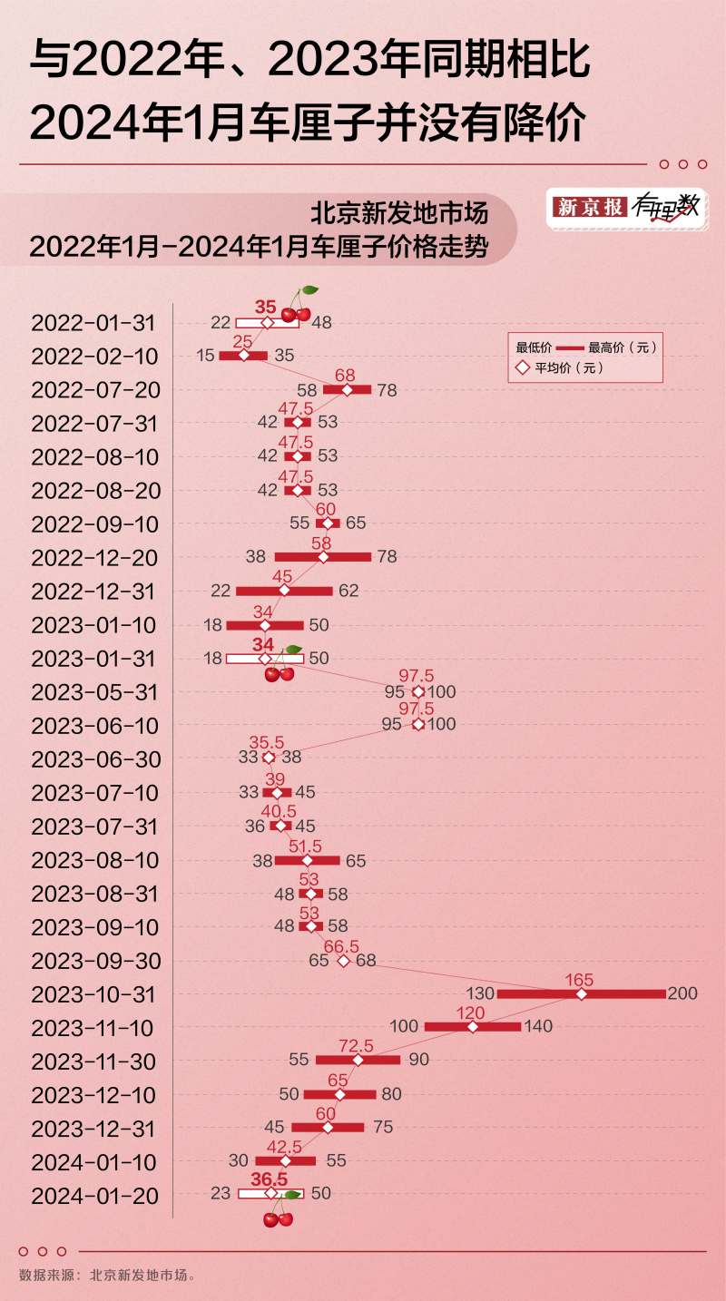 但我们把整个时间线拉长,同比2022年及2023年1月份车厘子的均价,发现2024年1月20日均价36.5元/斤,不仅没有比2022年1月和2023年1月降低,反而还增高了一些。