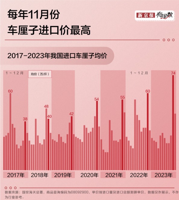 从海关进出口数据来看,近几年来车厘子的价格浮动并不大,而且几乎每年11月份都是价格最高的,按照进口量与进口总额测算,2023年11月海关进口车厘子的价格达到74元/斤,新发地2023年11月10日的价格为120元/斤,随后12月份进口价便降了下来,仅44元/斤。
