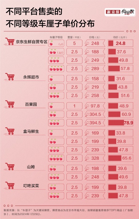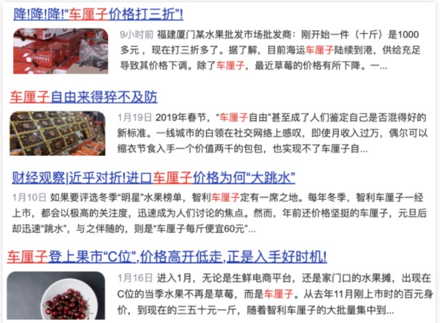 当我们把目光转向批发市场时,我们发现1月10日车厘子的果品均价42.5元一斤,1月20日36.5元一斤。也就是说,电商平台推出的价格比1月20日批发市场要高13元左右。
